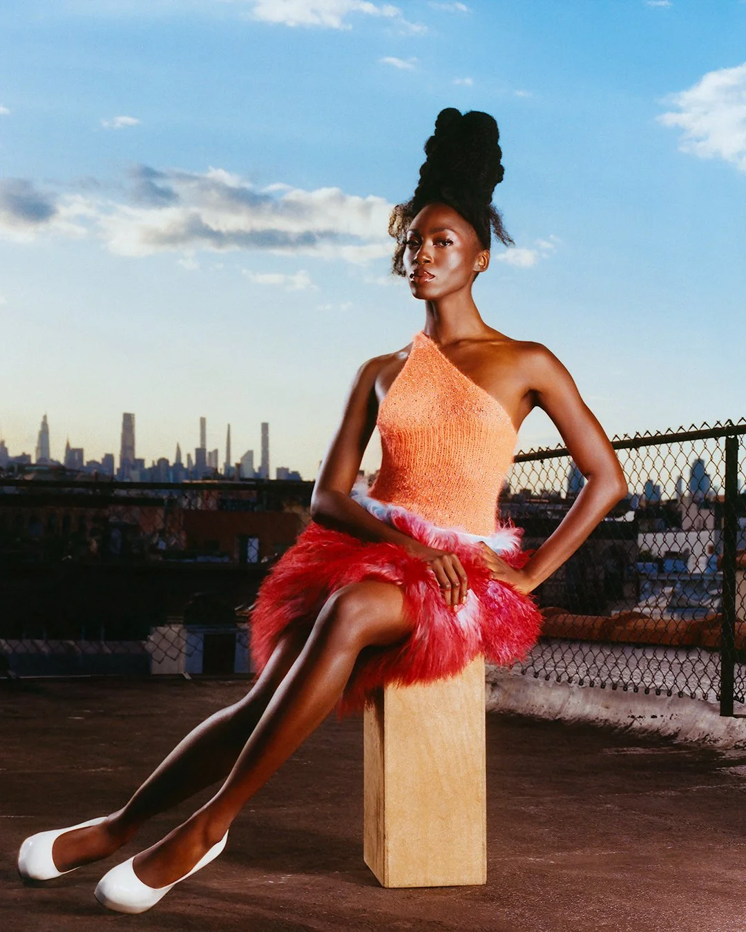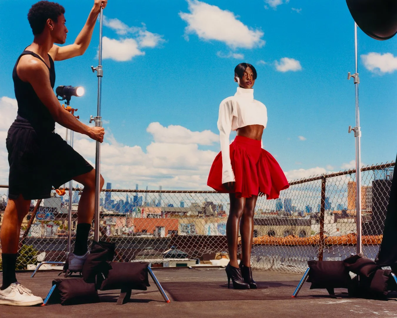 This rooftop editorial reveals the beauty of the process itself. The set remains visible — backdrops, crew, and all — blurring the line between performance and production. Through bold color and expressive movement, the images capture fashion as both creation and moment-in-motion.